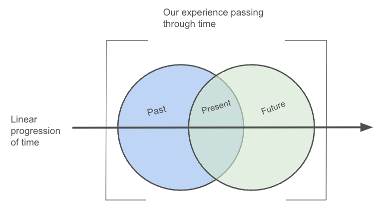 The overlap at the center of the diagram is the totality of the information we have at any one moment in time, made up of what we’ve taken with us from the past, what we have in the present, and what we theorize about the future.